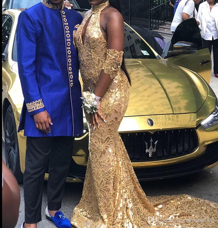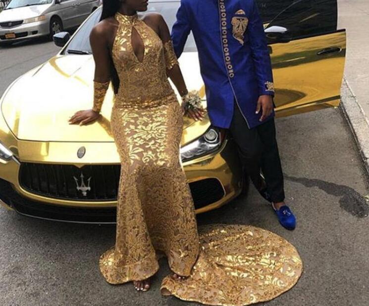 Gold Long Mermaid Prom Dresses New Sleeveless High Neck Sweep Strain Formal Evening Dress Party Gowns Custom Made