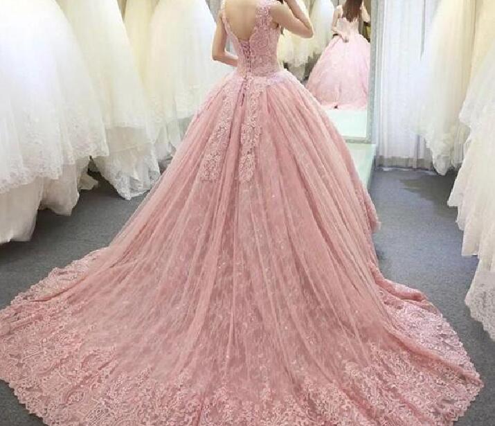 Luxury Quinceanera Dresses A Line Jewel Cap Sleeve Sweep Train Prom Dresses With Lace Applique Backless Sweet 16 Gowns