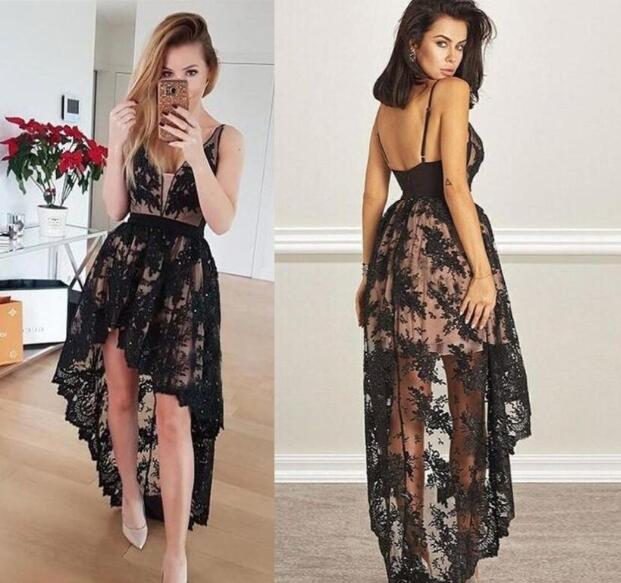 Black Lace Prom Dresses Hi Lo Vintage Formal Evening Gowns V Neck Zip Back Girls Party Dress 2K19 African Black Girls Dress
