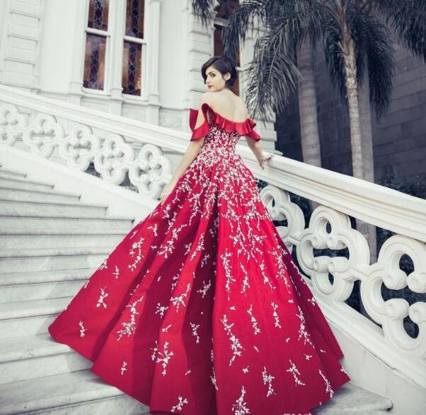 Red Prom Dresses Sexy Off The Shoulder Evening Gowns A Line White Appliques A Line Party Dress Arabic Women Formal Wear