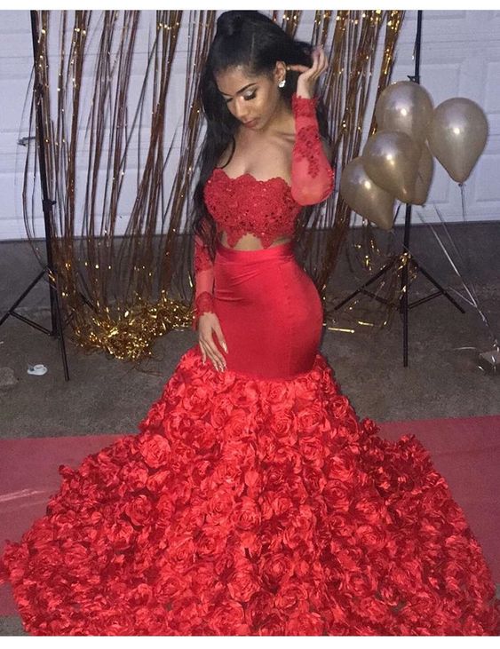 Red Mermaid African Girl Prom Dresses Lace Bodice Red Rose Lace Evening Formal Gowns