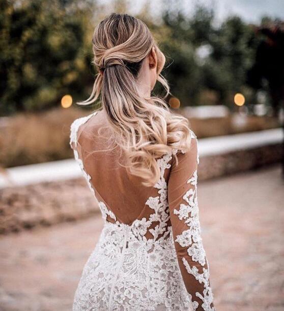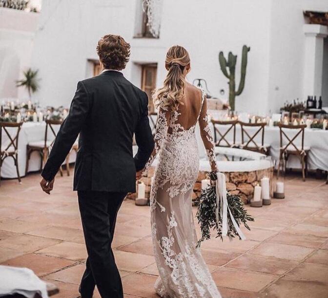 Sexy Beach Long Sleeves Mermaid Wedding Dresses Crew Neck Open Back Applique Lace Plus Size Bohemian Bridal Gowns