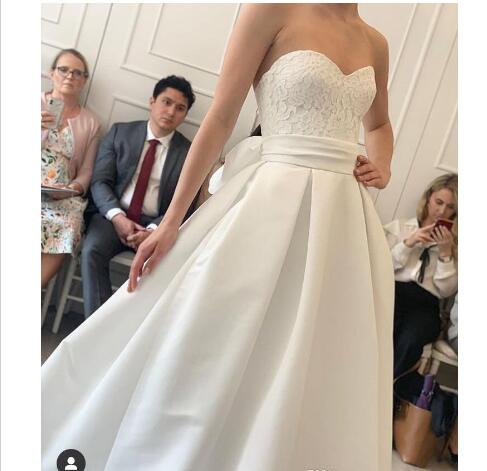 Elegant Sweetheart White Wedding Dresses A-line American Bridal Gowns Simple Lace Satin Bow Back Vestido De Novia Sweep Train Wedding Gowns
