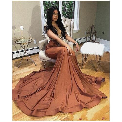 African Mermaid Prom Dresses Sexy Deep V Neck Gold Appliques Cap Sleeve Evening Party Gowns Black Girl Formal vestidos de gala
