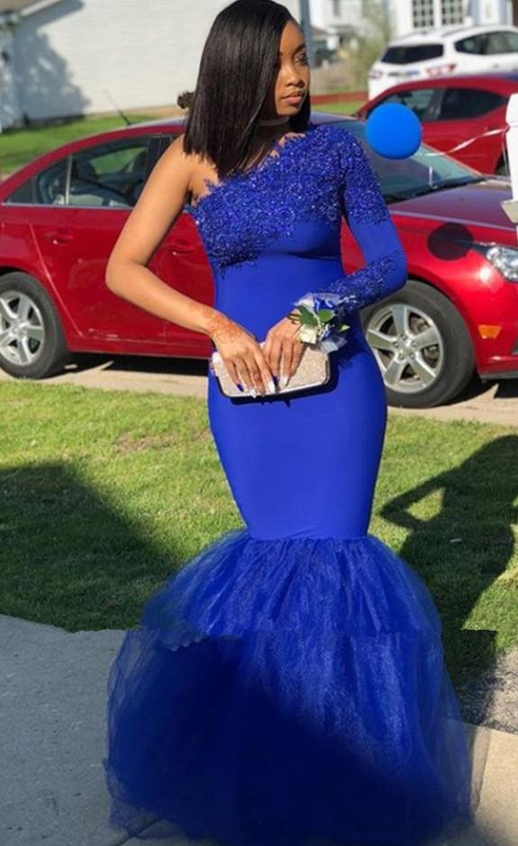 Sexy Royal Blue South African Prom Bridesmaid Dresses 2020 mermaid One shoulder with long Sleeves Lace Cheap Evening Formal Pageant Dress