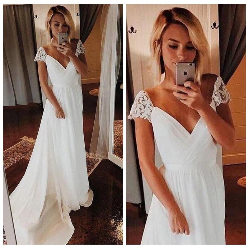 Classic V-Neck Vintage Wedding Dresses with Short Lace Capped Sleeve A Line Beach Wedding Dresses with Long Tail White Chiffon Wedding Dress