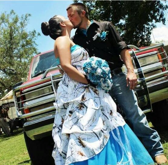White And Blue Camo Pickup Dresses Strapless Satin Snow Camo Wedding Dresses Brides Gown