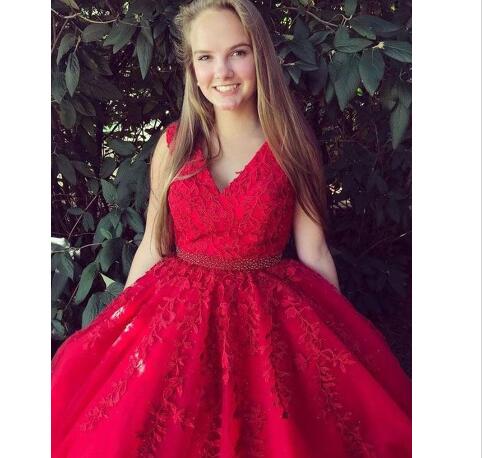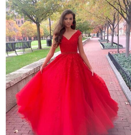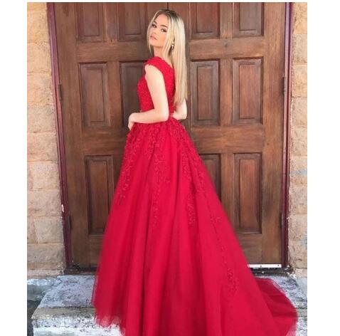 Long Red Prom Dresses Women Deep A Line V Neck Lace Appliques Sweep Train Formal Prom Evening Dresses