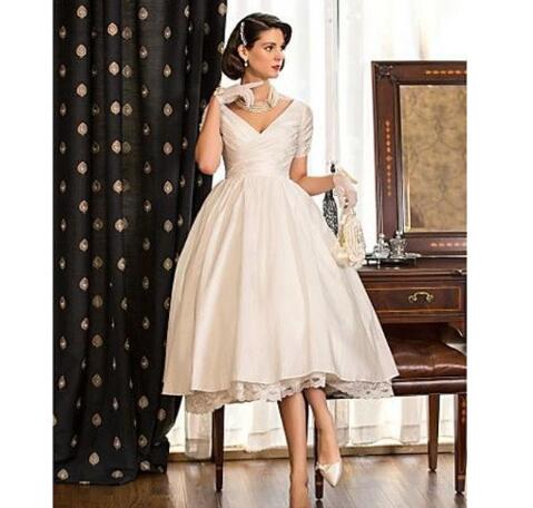 Tea Length Generous Wedding Dresses Short Seeves V Neck Lace Satin Bridal Wedding Gowns Custom Made Wedding Party Dress