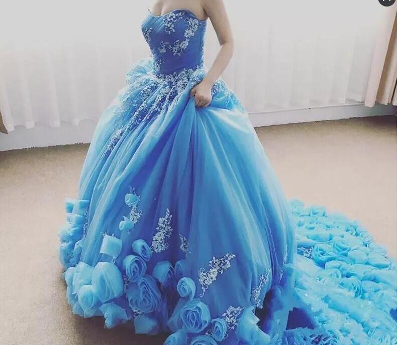 Sky Blue Lace Sweep Train New Design Ball Gown Wedding Dresses Sweetheart Lace-up Empire Tulle Tiered Skirts Hand Made Flowers Gowns