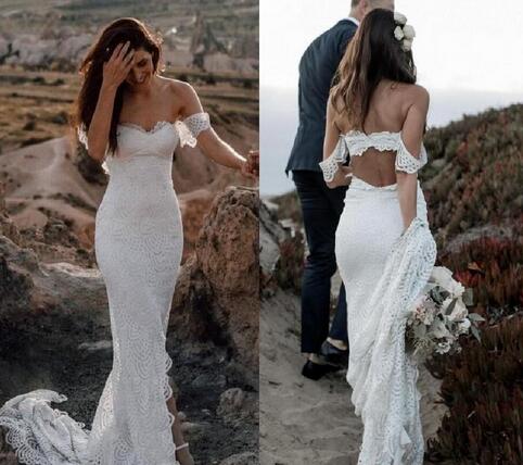 Sexy Backless Boho Side Slit Wedding Gowns Off Shoulder Beach Bridal Dress Plus Size Vestidos De Noiva Elegant Bohemian Lace Wedding Dress