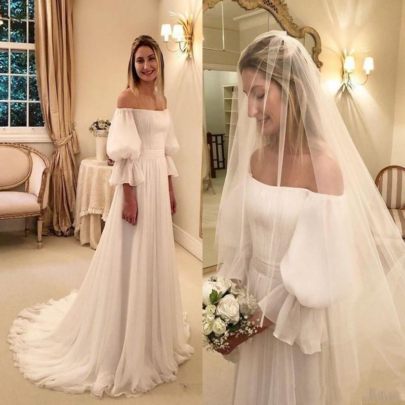 Elegant Bateau Neck A Line Wedding dresses With Long Sleeves Chiffon Pleats Poet Sleeves Floor Length Custom Made Beach Wedding Dress