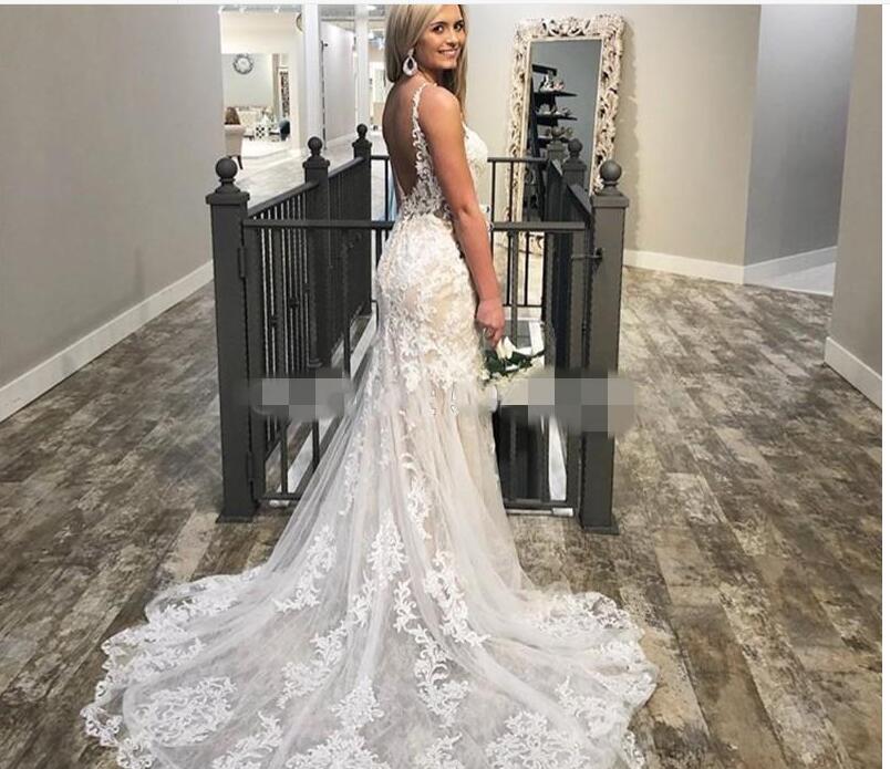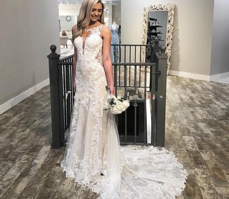 Mermaid Wedding Dresses Scoop Neck Backless Lace Appliques ruched Sleeveless Elegant Vestido De Novia court Train Bridal Gown