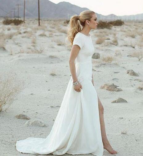 Summer Satin Backless Beach Wedding Dresses Jewel Neck Short Sleeve Front Split Boho Bridal Gowns Wedding Dress Custom Made
