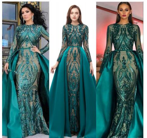 Luxury Dark Green Mermaid Evening Dresses Jewel Long Sleeves Sequined Lace Detachable Train Sequins Plus Size Evening Party Gowns Wear