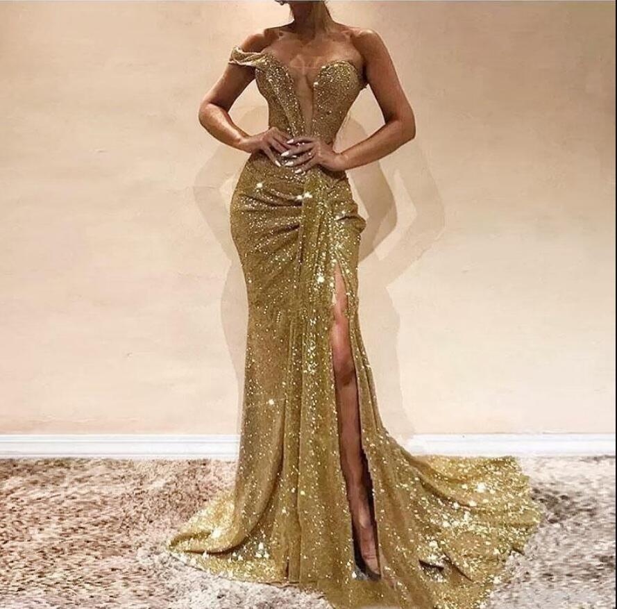 Sexy Gold Sequins One Shoulder Prom Dresses Mermaid Pleats Slit Plunging Long Formal Evening Party Gowns Robe De Soiree