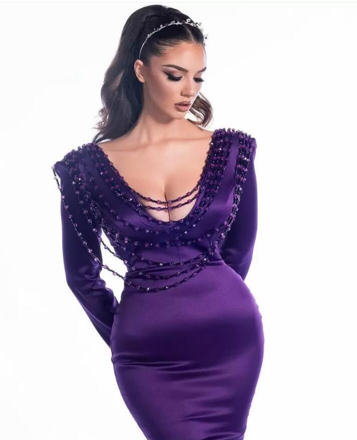 Royal Purple Evening Dresses Glitter Beading Ruched Satin Mermaid Pregnant Prom Dress Long Sleeves V Neck Robe de mariée Party Pageant Gowns