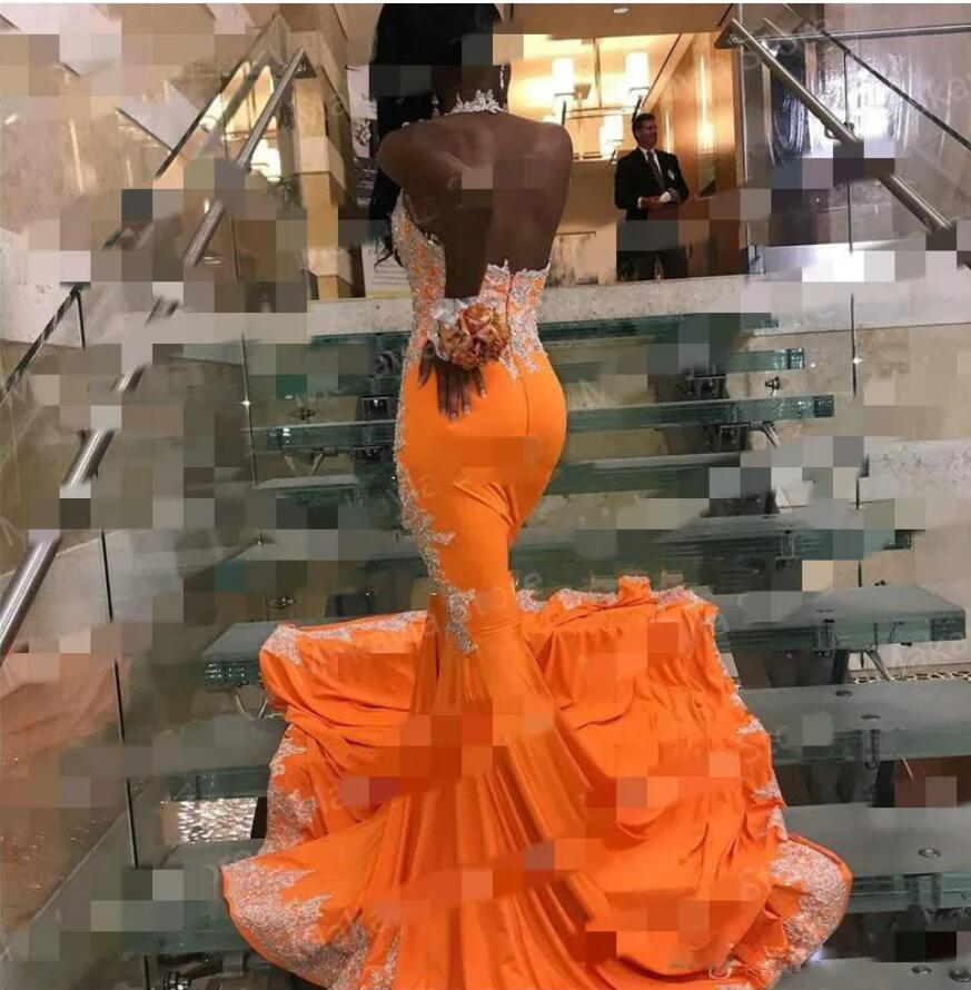 Orange Halter Mermaid Long Prom Dresses Black Girls Lace Applique Backless Floor Length Formal Party Evening Gowns