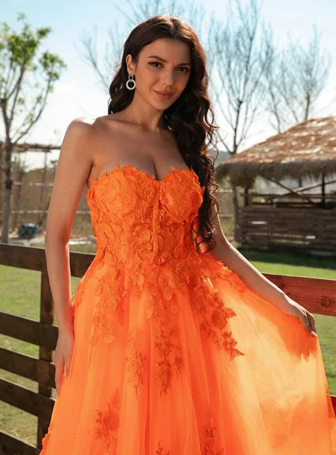 Gorgeous Orange Prom Dresses Sexy Backless A Line Strapless Lace Appliques Ruffles Tulle Long Evening Gowns Plus Size
