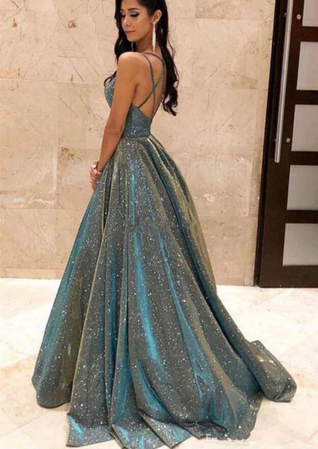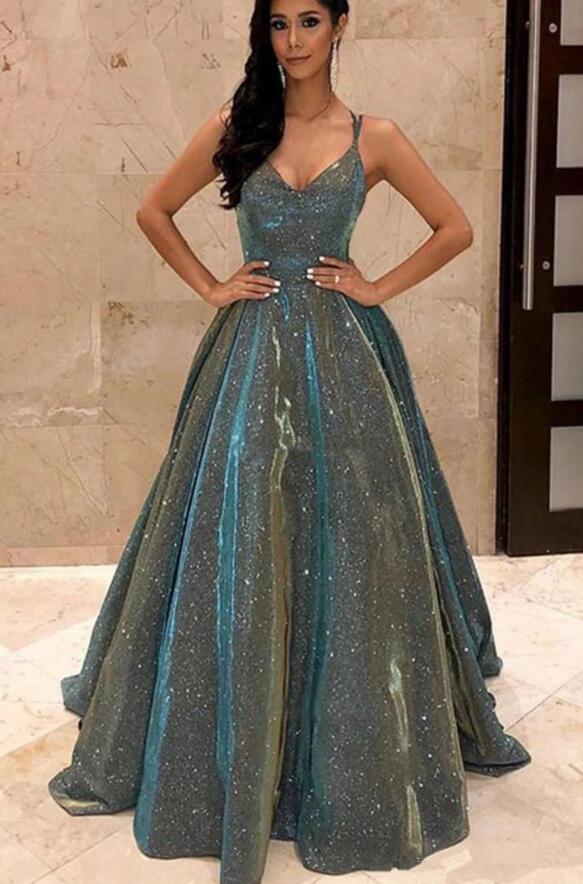 Shiny Sequins Lace Long Prom Dresses Spaghetti Strap Cross Back A Line Formal Evening Party Gowns Vestido De Fiesta