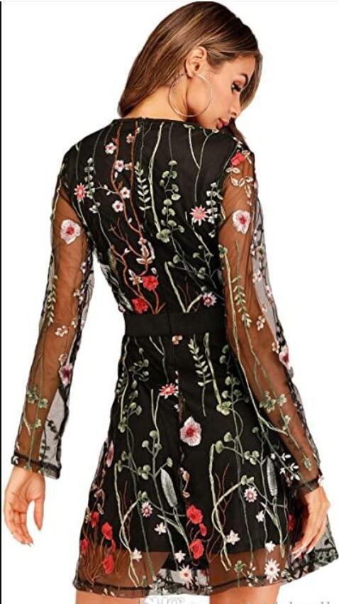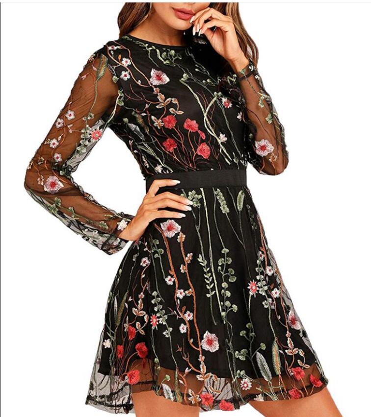 Women's Floral Embroidered Mesh Short Homecoming Dresses Sheer Long Sleeves Cocktail Party Dress Cheap Mini Little 8th Graduation Prom Dress