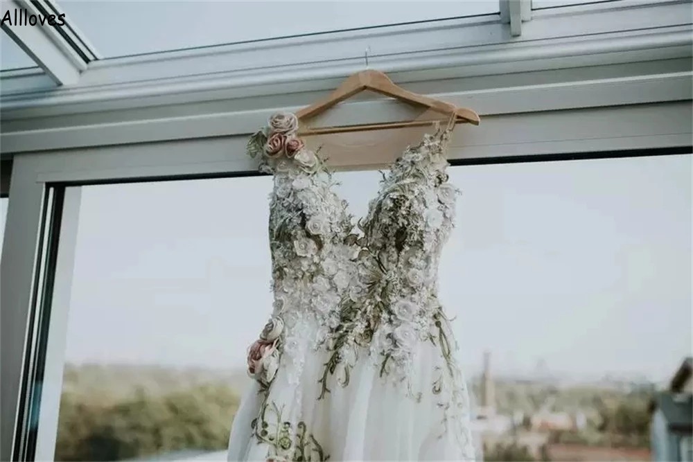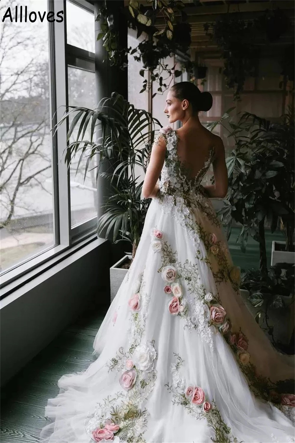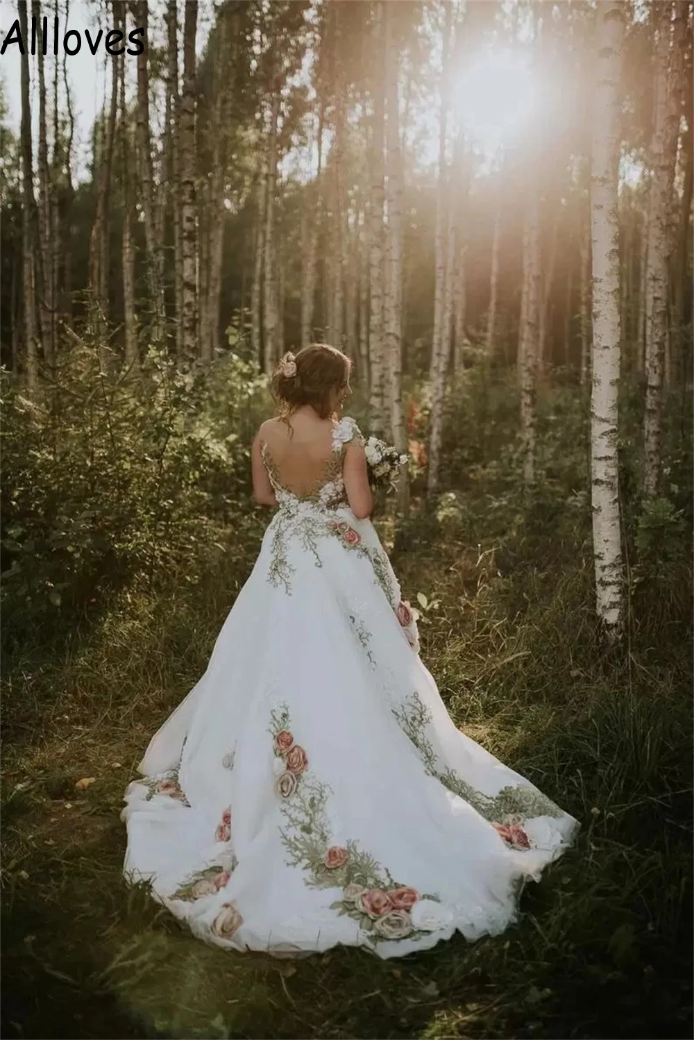 Fairy Floral Lace A Line Wedding Dresses For Brides Romantic 3D Flowers Sheer Neck Boho Garden Bridal Gowns Sexy Open Back Cap Sleeve