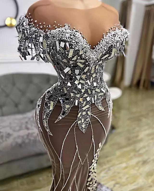 Plus Size Arabic Beading Mermaid Split Prom Dresses Sheer Neck Short Sleeve Evening Formal Party Second Reception Gowns