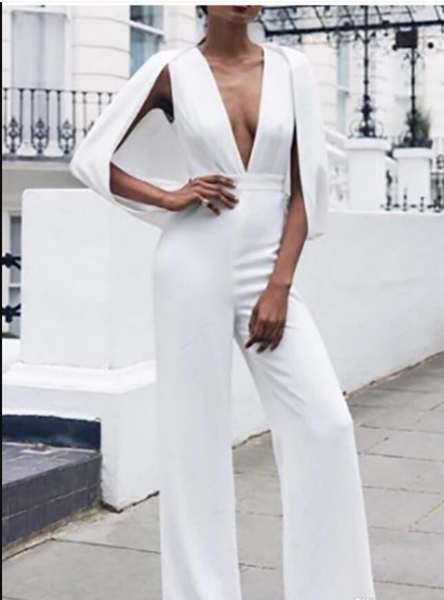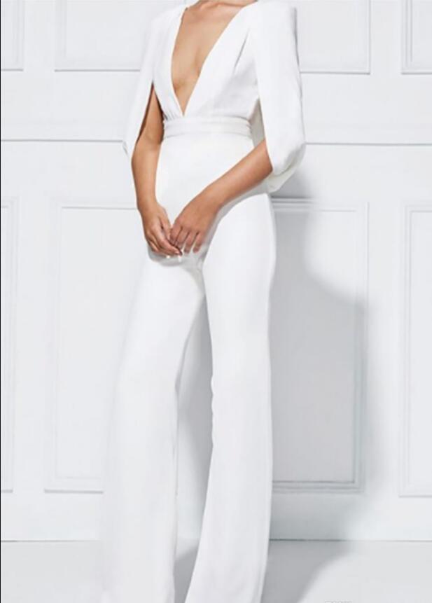 White Jumpsuits Evening Dresses With Wrap Deep V Neck Sexy Women Formal Dresses Floor Length Prom Party Gowns Custom Made