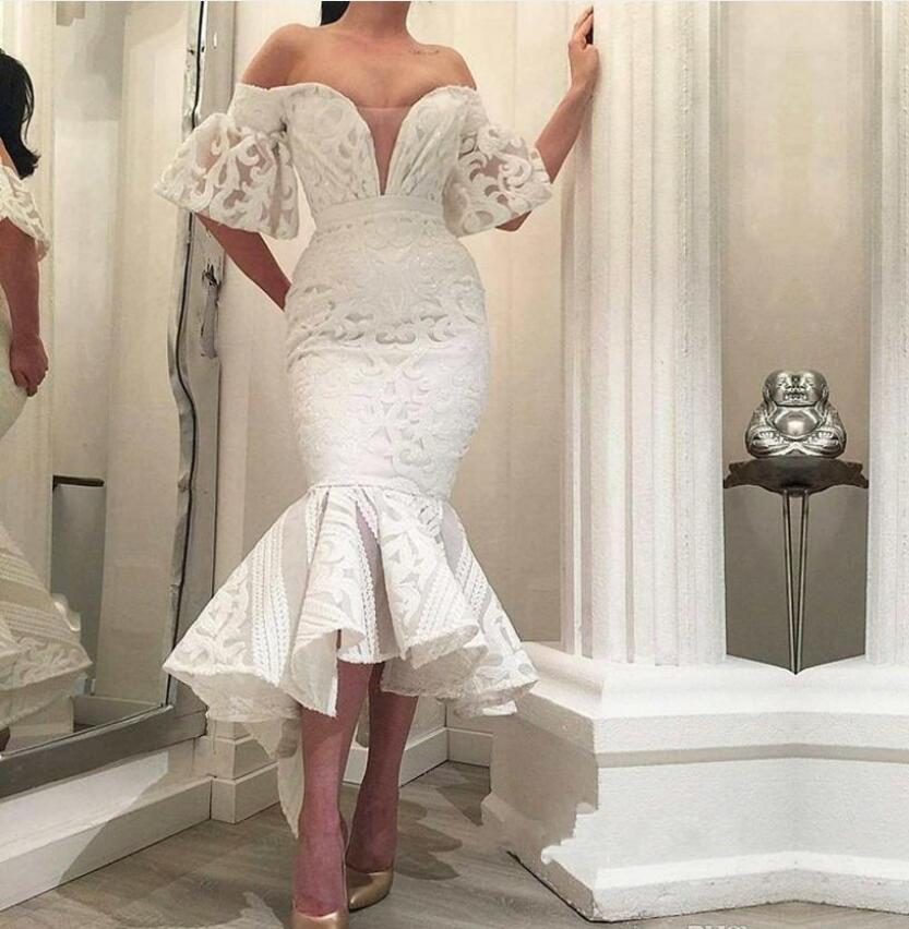 Gorgeous White Lace Wedding Dresses Mermaid Wedding Dress Off Shoulder Tea Length Noble Close fitting Bridal Gowns