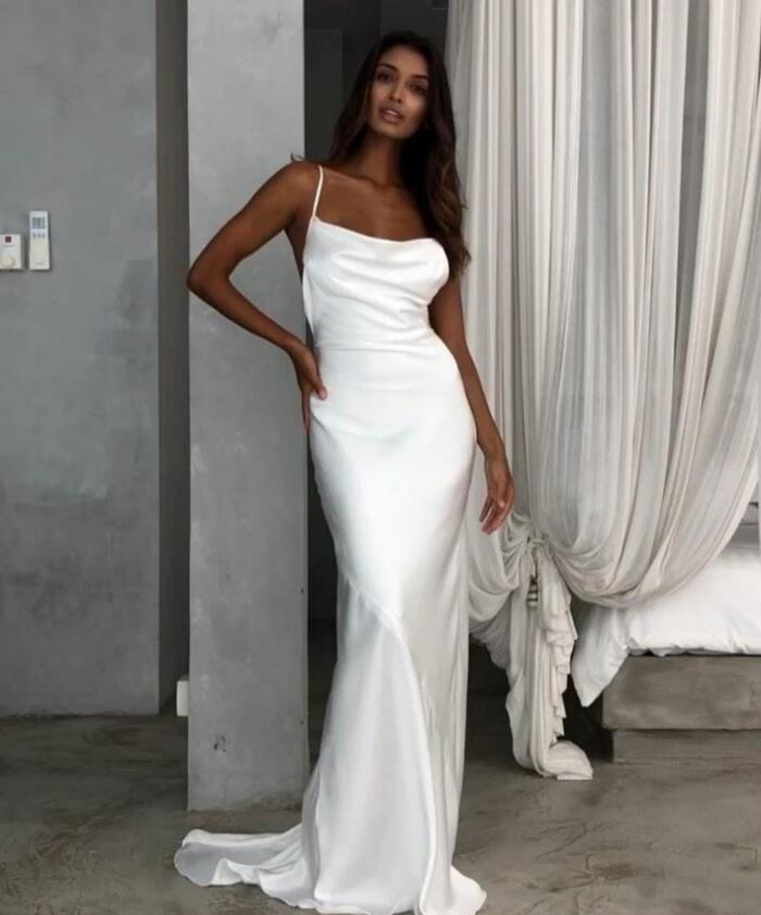 White Spaghetti Straps Satin Mermaid Long Wedding Dresses Ruched Boho Beach Bridal Gowns