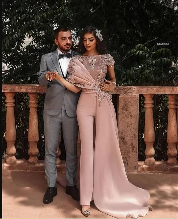 Dusty Pink Women Jumspuits Evening Dresses Arabic Style Short Sleeves Lace Applique Beaded Peplum Lady Pantsuit