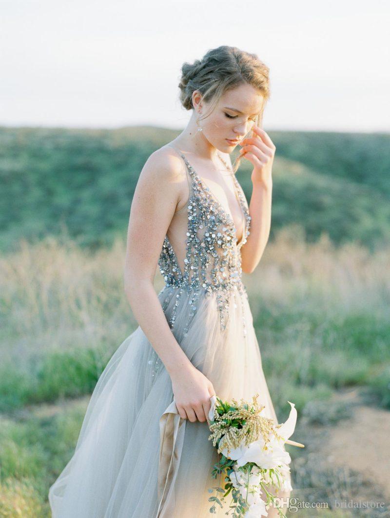 Bing Sequins Beaded SummerHoliday Wedding Dress Low Back Tulle Slver Bridal Gowns