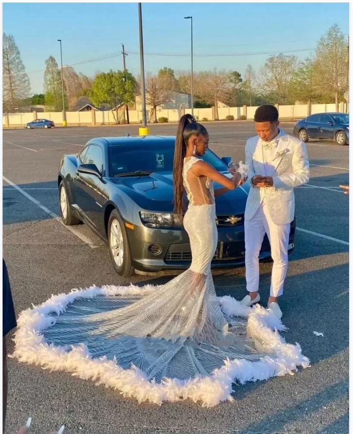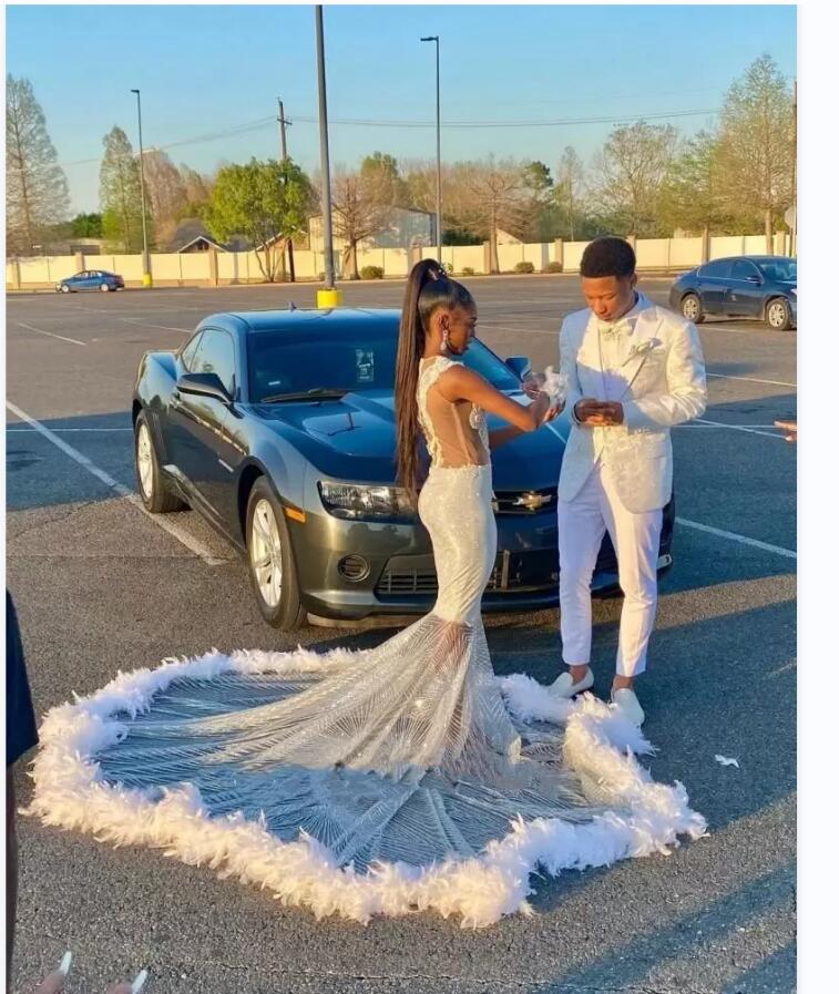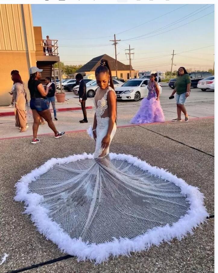 Sparkly Silver Crystal Mermaid Prom Dresses Beaded Sequined Black Girls Evening Dress With Feather Sleeveless Party Gowns
