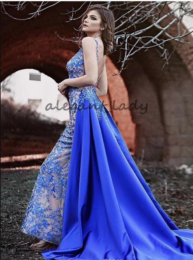 Evening Dresses With Detachable Overskirt Lace Tulle Applique Beaded V Neck Sweep Train royal blue Formal Party Plus Size prom Gown