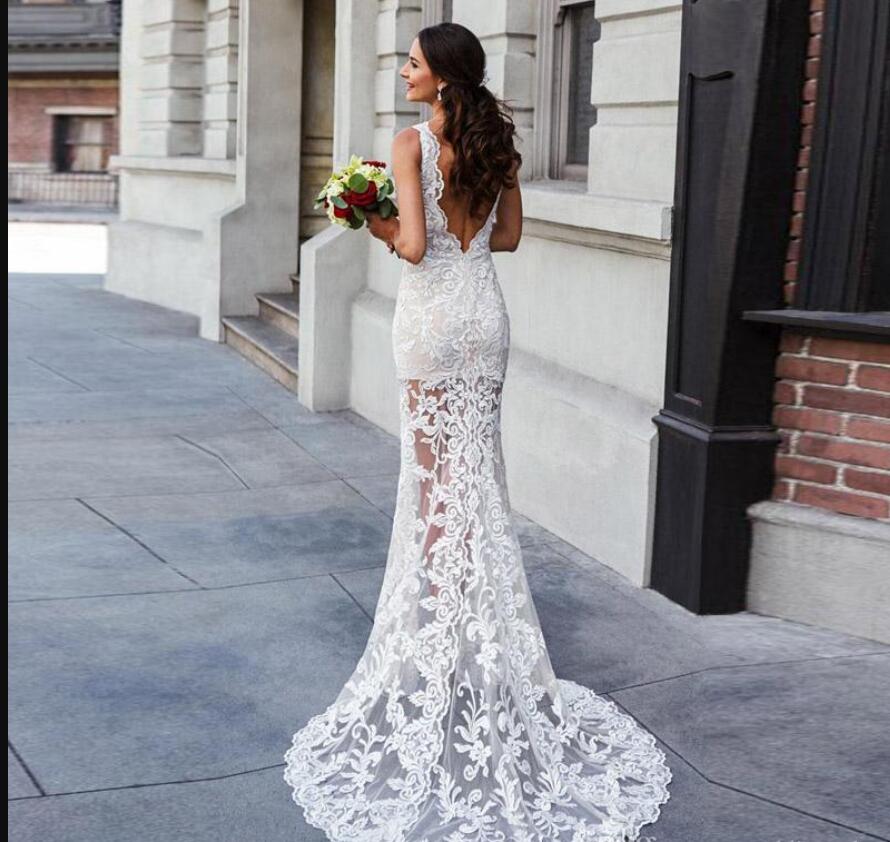 Deep V-Neck Embroidery Mermaid Wedding Dresses See Through Split Front Summer Bridal Gown Sweep Train Boho Bridal Dress