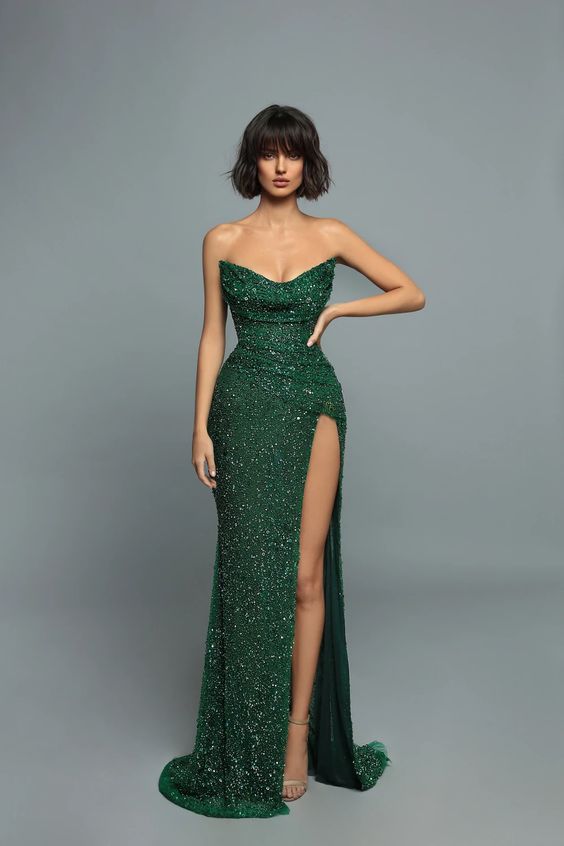 Dark Green Mermaid Sequins Lace Side Slit Prom Dress Evening Gowns