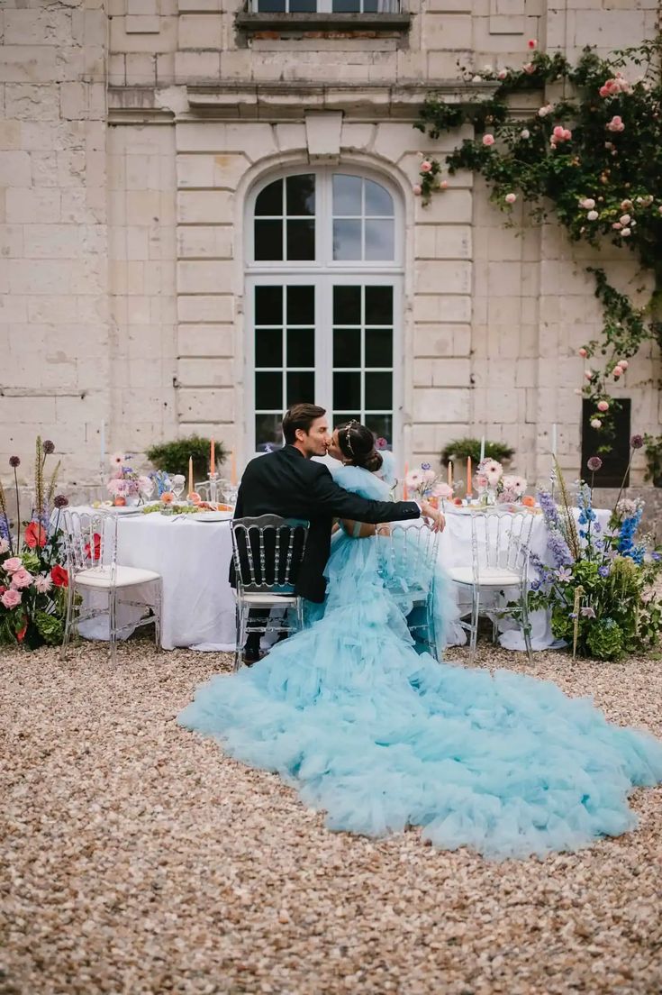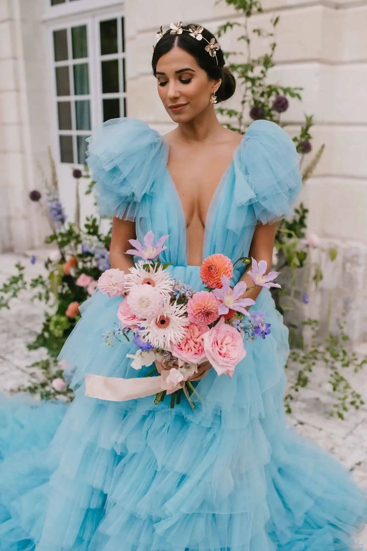 Baby Blue Tiered V Neck Beach Boho Wedding Dress Bridal Gown Wedding Gown