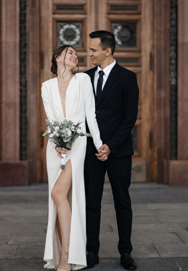 Simple Sheath V Neck Long Sleeve Side Slit Beach Boho Wedding Dress Bridal Gown Wedding Gown