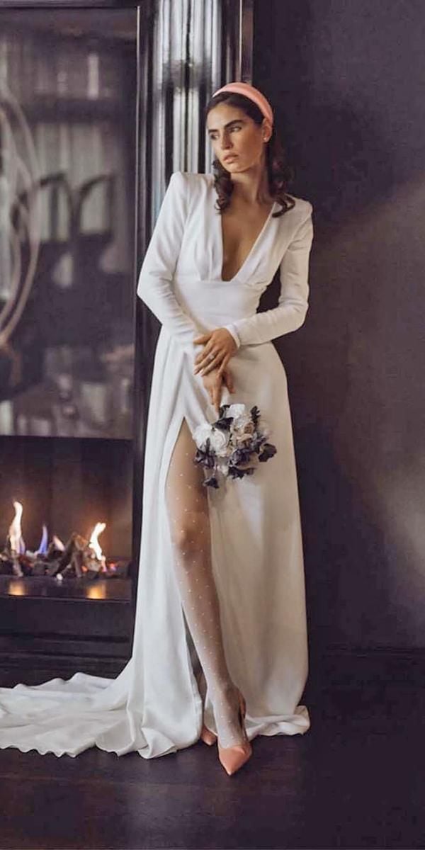 Sexy A Line V Neck Long Sleeve Side Slit Beach Boho Wedding Dress Bridal Gown Wedding Gown
