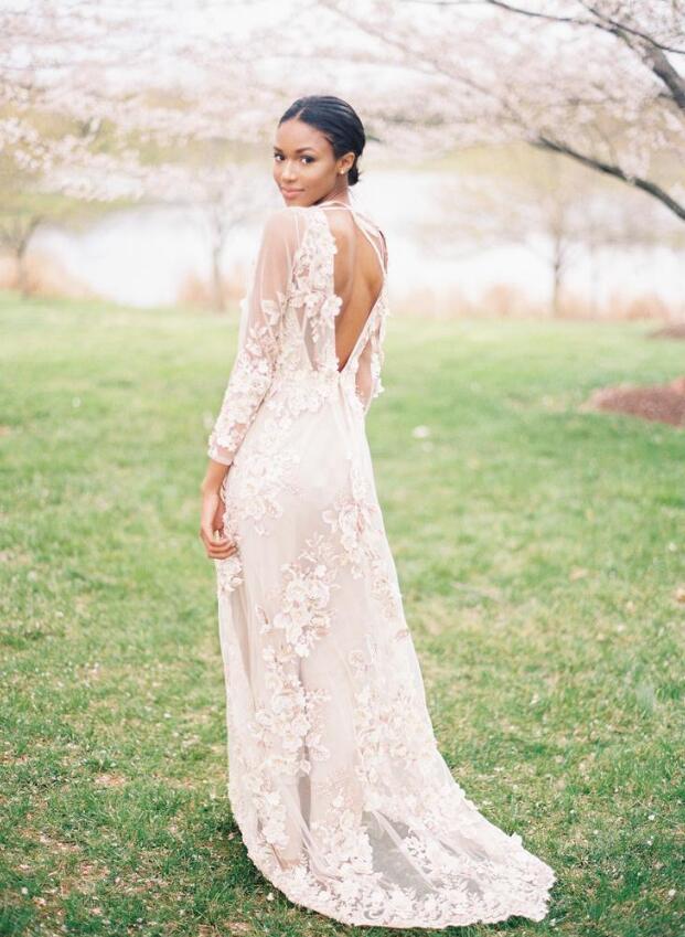 Pink Sheath Appliques Tulle Open Back Wedding Dress Bridal Gown Wedding Gown