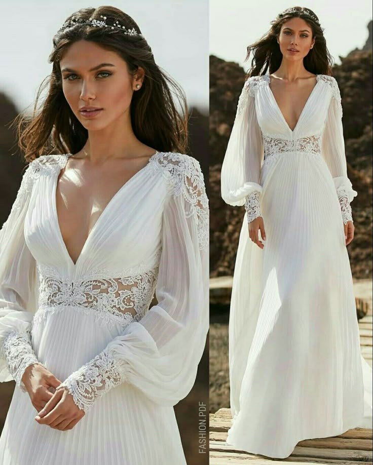Simple A Line Deep V-neck Long Sleeve Chiffon Wedding Dress Bridal Gown Wedding Gown