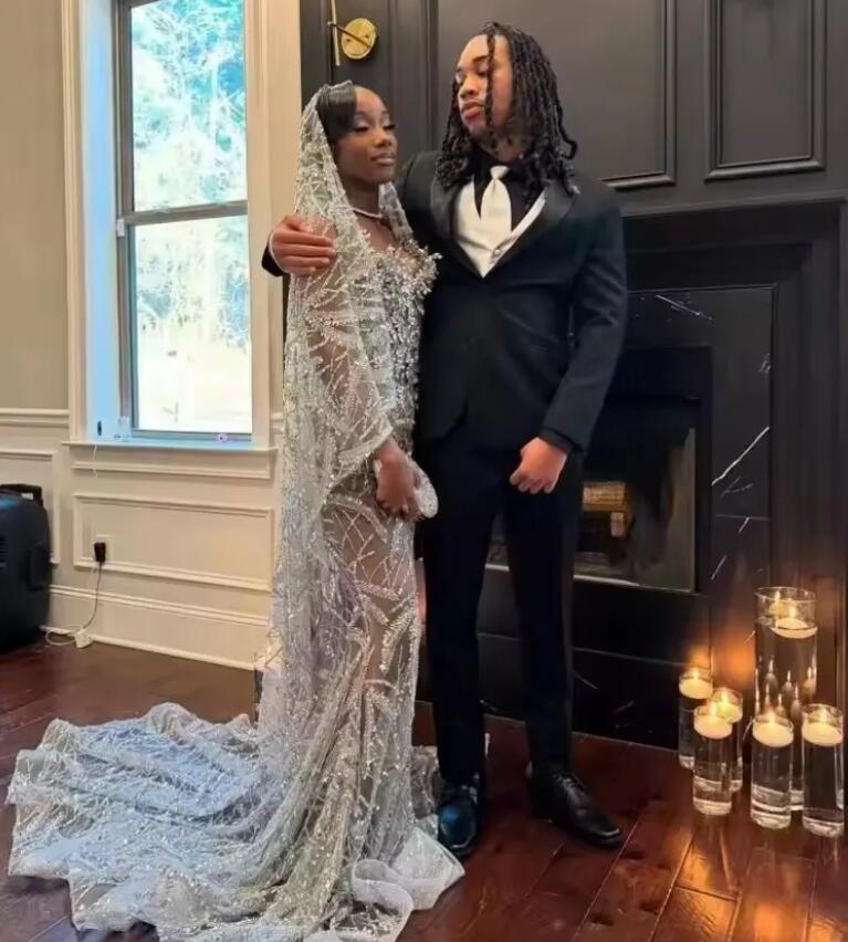 Vintage Silver Lace Mermaid Prom Dresses With Veil Sparkle Formal Birthday Party Illusion Lace Evening Gown Customized
