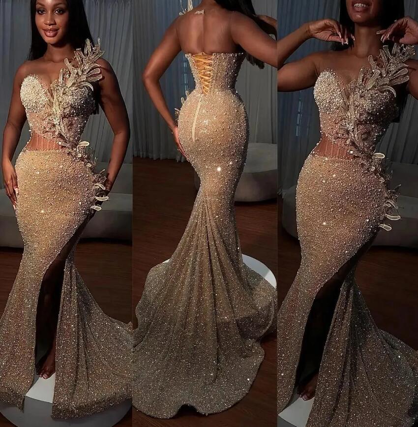Mermaid Prom Dresses Sparkly Sequins Illusion Bodice Beaded Applique High Split Custom Made Pleats Evening Gown Formal Ocn Wear Vestidos Plus