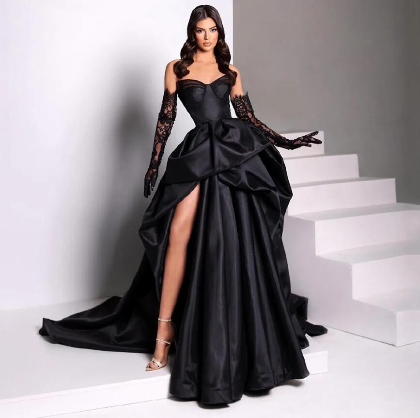 Sexy Black Sweetheart Prom Dresses Corset A Line Satin High Low Asymmetrical Evening Gowns