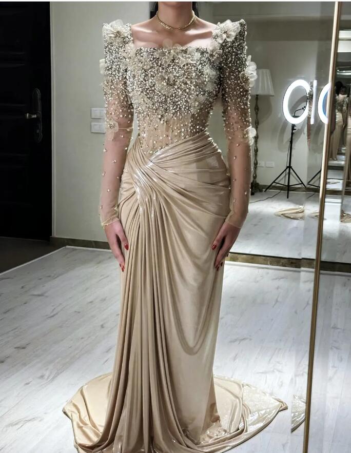 Elegant Champagne Mermaid Prom Dresses Beaded Long Sleeves Corset Evening Gowns 3D Floral Appliques Ruched Formal Dress For Women