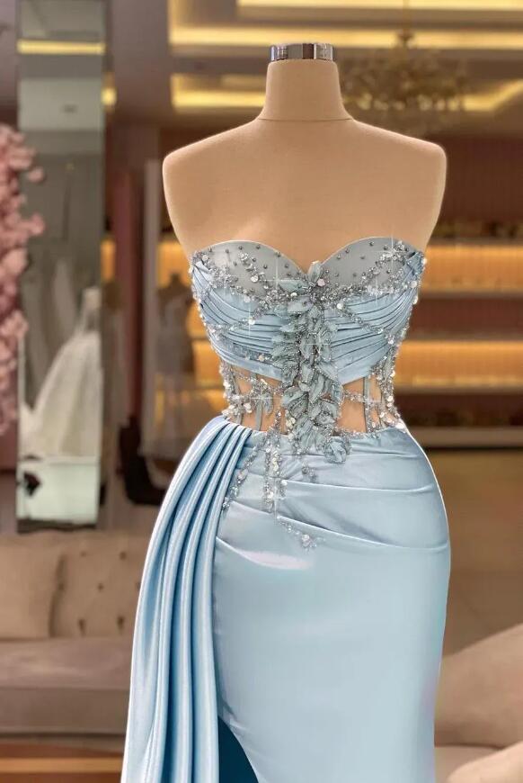 Light Blue Mermaid Evening Illusion Top Crystals Sweetheart Pleats Satin Split Party Ocn Gowns Prom Dresses Wears