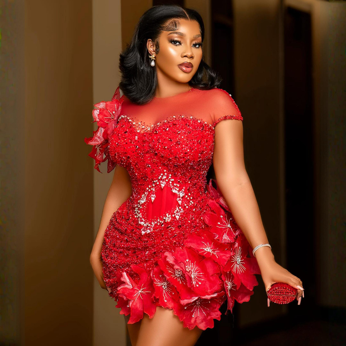 Cocktail Dresses Sheer Neck Illusion Short Mini Prom Dress Sequined Lace 3D Flowers Beaded Pearls Pleated Evening Formal Gowns