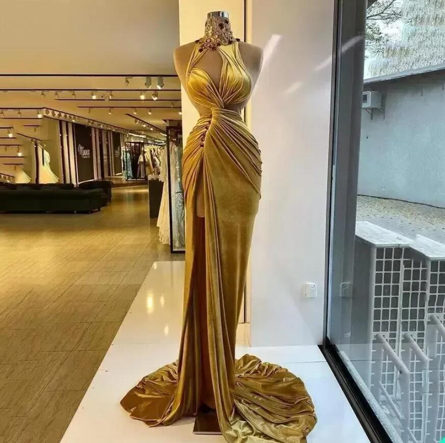 Gold Velvet Prom Dresses Elegant Ruched Long Sweep Train Mermaid Evening Party Gowns Side Slit High Neck Crystals Beading Sleeveless