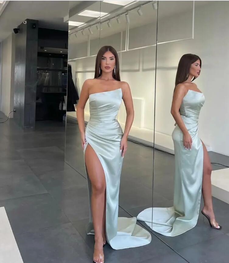 Prom Dresses For Women Black Girls Strapless Satin Pleats Draped High Side Split Floor Length Formal Evening Pageant Birthday