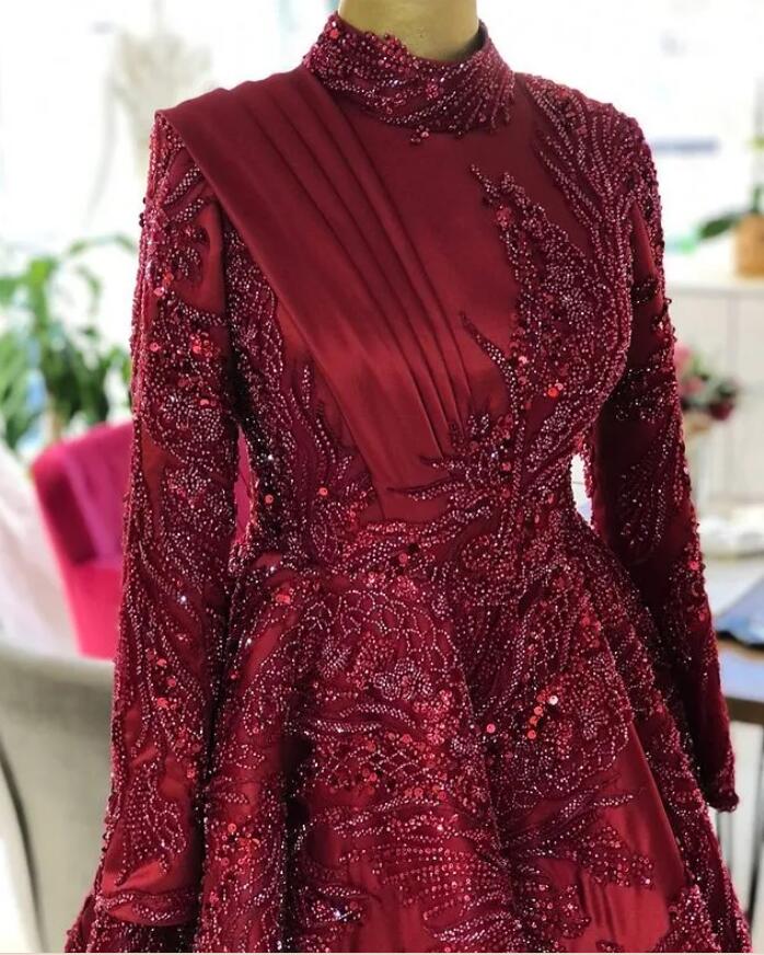 Burgundy Luxurious Muslim Prom Dresses Lace Beaded Evening Formal Party Second Reception Gowns Dress